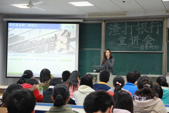 首先,渣打银行南京分行的投资顾问刘悦向同学们介绍了渣打银行的久远历史、经营状况以及渣打的企业“here for good”的文化理念,并着重介绍了渣打对于公益事业的贡献,让同学们了解到渣打作为世界五百强企业的丰富内涵。