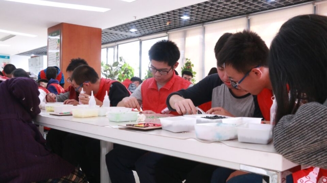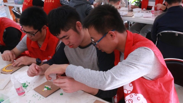 终于到达了期待已久的宁馨家园,志愿者们开始整装,准备开始活动。首先,宁馨负责人黄老师再次为志愿者们强调需要注意的事项,并对宁馨家园做简单的介绍,随即带领着我们进行参观,这里有孩子们辛勤的劳动成果展示,他们精巧的手工作品,确实让我们大吃一惊。然后老师给我们分发了五颜六色的豆子及配有动画图片的小画板,交代给我们具体的任务。领到任务后,同学们立即行动起来,各自挑选着适合自己的的画板和豆子,不一会儿,主角登场了——一群洋溢着欢乐的孩子们与志愿者一起完成任务,虽然他们注意力很难长时间集中,但是志愿者们非常有耐心的和他们交流,悉心指导他们,手把手的教他们摆豆子,粘豆子。