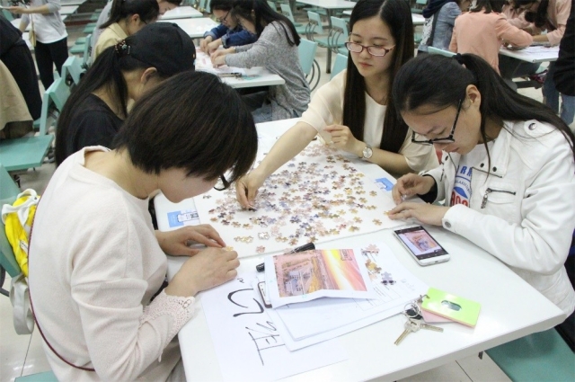 拼图比赛正式开始,经过40分钟齐心协力的合作与热闹非凡的讨论,由四个心灵手巧的女生组成的小组最先完成拼图作品。
