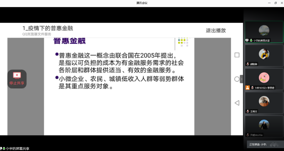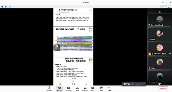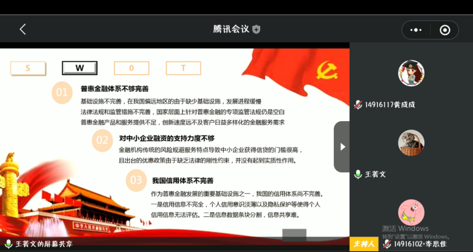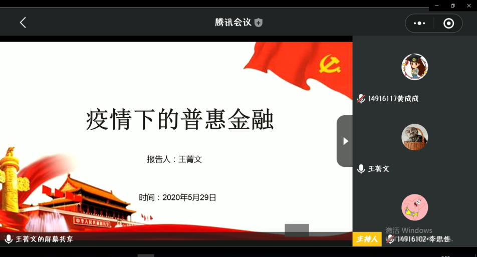 王菁文同学分三个部分展开了她的党课。分别是对普惠金融进行概述,疫情影响下我国普惠金融发展的现状和社会各界的举措。