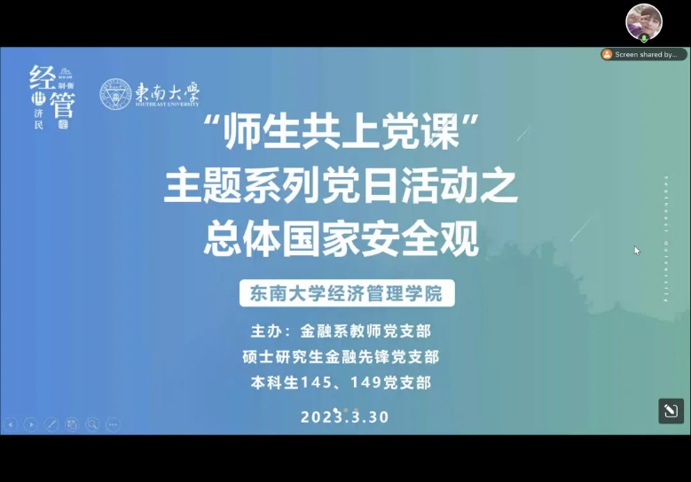 为深入贯彻习近平新时代中国特色社会主义思想,加强对总体国家安全观的宣传和贯彻落实,增强全体党员和广大师生的国家安全意识,2023年3月30日,电影网站 金融系教师党支部、硕士研究生金融先锋党支部、本科生145党支部,本科生149党支部共同开展了“师生共上党课”系列主题党日活动之总体国家安全观党课学习。党课由李守伟老师主讲,本科145党支部刘知源同志主持。