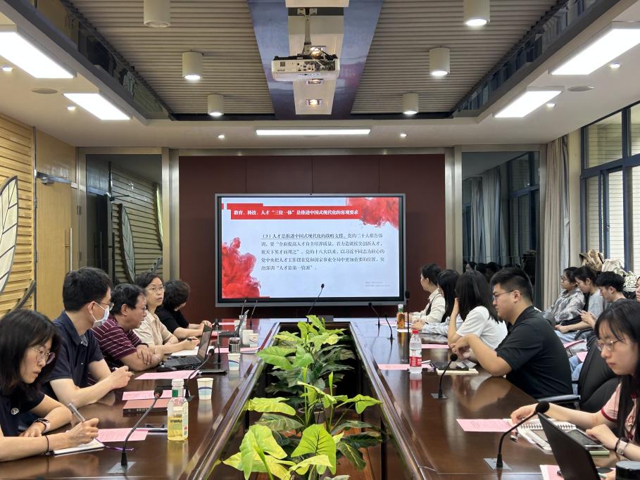 学院党委委员陈良华以“学习习近平总书记关于教育科技人才的重要部署”为主题开展领学。陈良华老师讲到指出,教育、科技、人才是全面建设社会主义现代化国家的基础性、战略性支撑,三位一体,相互作用又相互促进。我们要落实好高校立德树人的根本任务,助力培养能担当民族复兴大任的时代新人,对标世界一流,打造中国特色世界一流大学。
