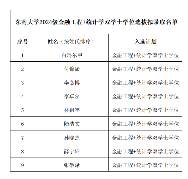 现对2024级金融工程+统计学双学士学位选拔拟录取名单进行公示。