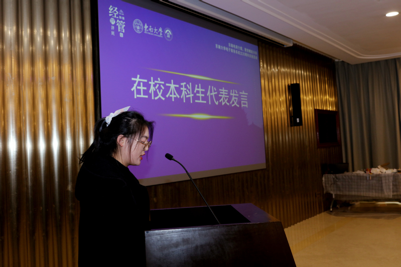 两位杰出校友丁少曦、赵博阳分享了他们在大学期间的收获与成长,并向学弟学妹们提出了殷切期望,鼓励他们在未来的人生道路上勇敢追梦,开创属于自己的精彩。同时,他们也分别从电商与其他传统行业的融合以及电子商务最新学术研究的视角,分享了他们对电商人才培养的多元化思路,为电子商务系未来的人才培养提供了新的思考路径。