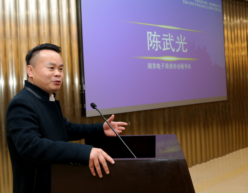 南京市电子商务协会秘书长陈武光在致辞中对电影网站 电子商务系为南京电商行业培养人才所做出的杰出贡献给予了高度评价。他特别提到即时零售电商和直播电商等新兴领域的发展,并对电子商务系积极开展校企合作,培养复合型人才的举措表示期待。