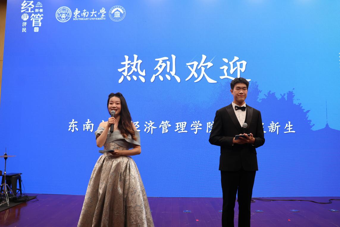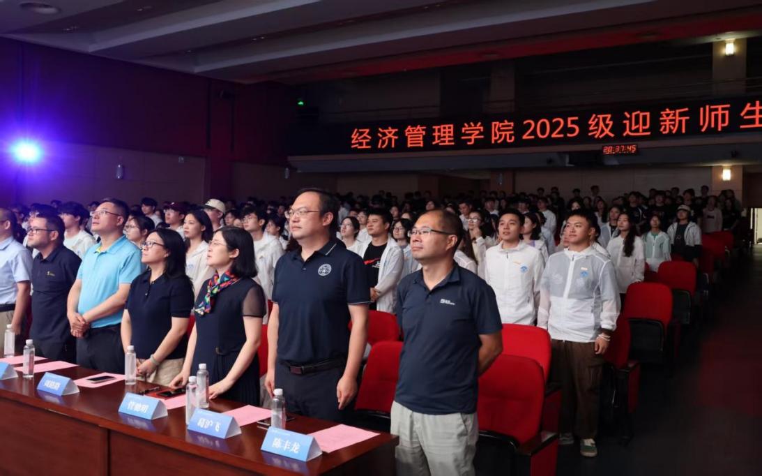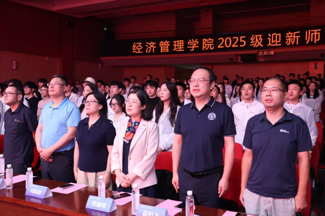 伴随着雄壮的国歌,迎新会正式拉开帷幕。院党委书记宋健刚,执行院长薛巍立,院党委副书记兼副院长尹威,管理科学与工程系教授、学科负责人仲伟俊,院党委委员、国际经济与贸易系党支部书记管驰明,国际经济与贸易系副系主任陈丰龙,工商管理系主任杜运周,院党委委员、工商管理系党支部书记周路路,工商管理系副系主任葛沪飞,财务与会计系教授陈良华,财务与会计系副系主任汪琼,金融系主任刘晓星,金融系教授周勤,经济学系主任岳书敬,经济学系副系主任吴一超,电子商务系主任何勇,院党委委员、电子商务系党支部书记史雅妮,院退休支部党支部书记、关工委副主任王文武,院全职博士后研究员Nida Hussain,辅导员代表等出席了本次活动。