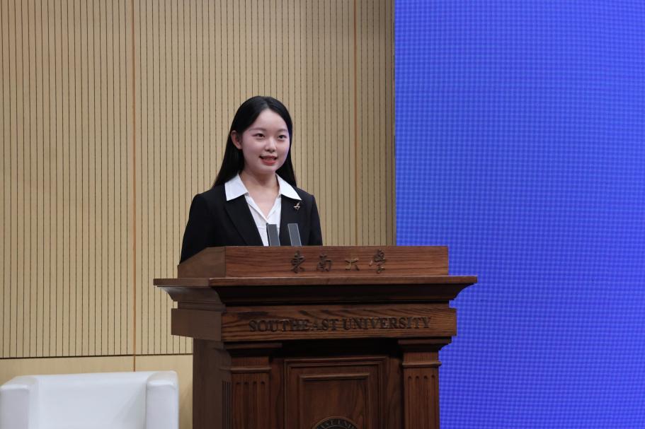 2022级本科生蒋肖阳以在校生代表的身份,结合自己的大学学习与生活感悟,与新生暖心对话。她提炼出“沟通”“突破”“沉淀”三个成长密码:鼓励同学们多与不同专业、背景的同学、老师以及企业进行沟通,抓住藏在对话里的成长机会;不惧未知、走出舒适区,勇敢扛起可能伴随失败的责任;不断总结沉淀,寻找属于自己的发展方向。最后,她强调大家的天花板是不设限的,鼓励大家敢于挑战、敢于争取,立报国强国大志向,做挺膺担当奋斗者。
