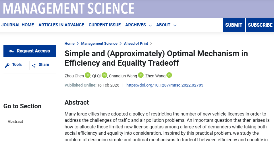 日前,电影网站 陈洲老师合作完成的论文在管理学顶级期刊《Management Science》在线发表。该论文聚焦稀缺公共资源怎么分配既公平又高效的现实难题,提出一种“先拍卖后抽签”的混合分配机制。陈洲老师为该论文第一作者。