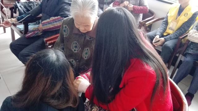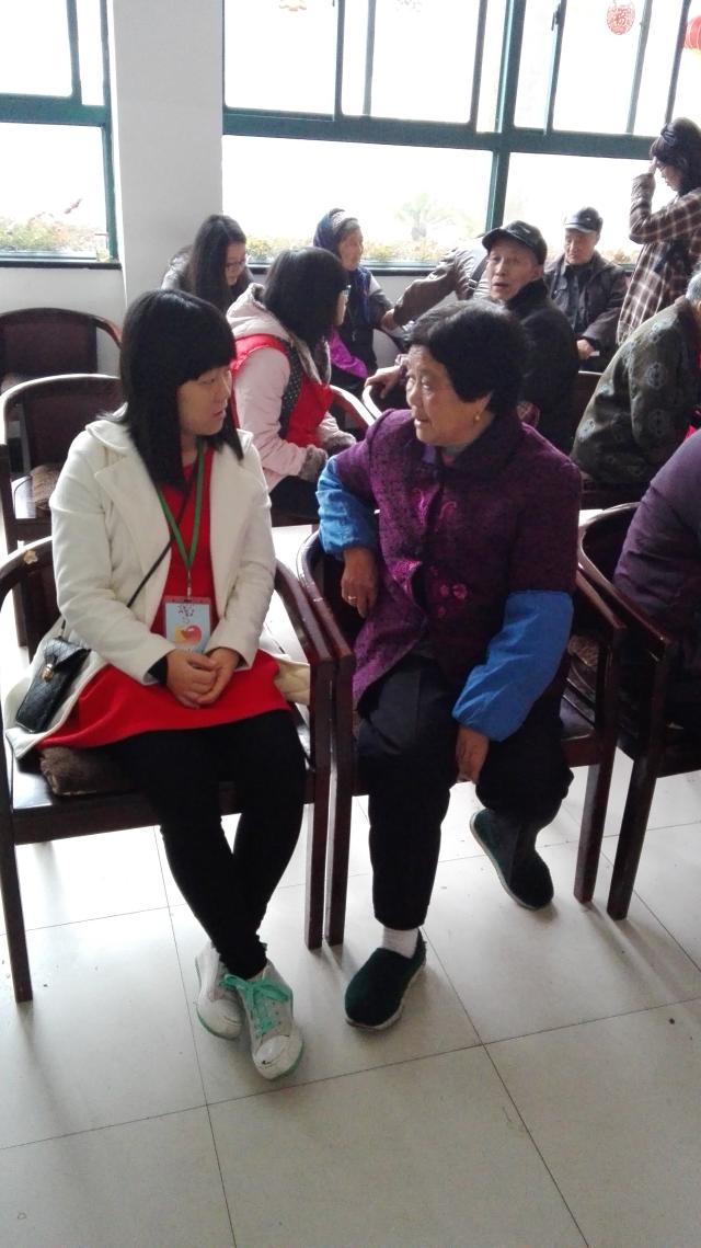 大清早,迎接志愿者们的便是老人们慈祥的笑容,挂上志愿者证的牌子,志愿者们便开始了行动。在活动室里,志愿者们坐在爷爷奶奶的身旁,轻声细语地陪伴他们聊天,志愿者的手拉着老人的手,显得格外地亲密,在小公园里,志愿者搀扶着老人,陪着他们散步看风景,在宿舍区里,志愿者热情地询问老人的生活,并且给他们表演节目,气氛融洽。