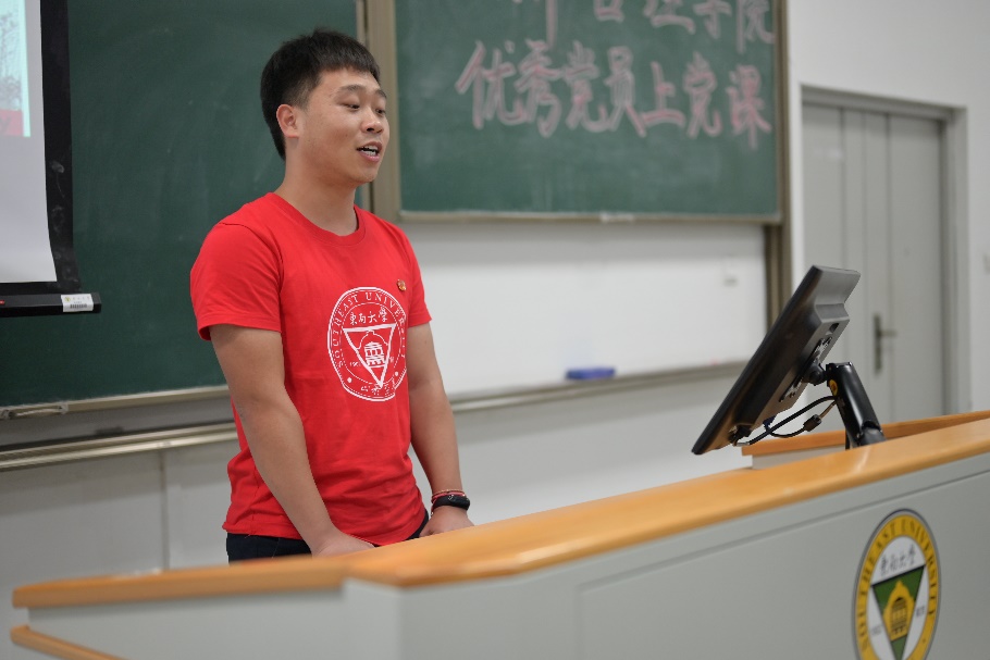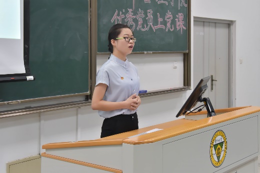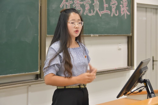 信息管理与信息系统专业2016级本科生张正红发表了题为《青年人的理想与担当》的讲演。她首先借助“马斯洛需求层次理论”,从社交需求、尊重需求和自我实现三个方面阐述了“我们为什么要入党”。接着她与新生分享“如何成为一名优秀的青年党员”的五点要求:一是要“志存高远,坚定理想信念”,二是要“脚踏实地,练就过硬本领”,三是要“修身养性、培育良好品性”,四是要“锐意进取,勇于开拓创新”,五是要“求真务实,坚持实干兴邦”。最后,她通过分享中美贸易战的视频鼓励大家要肩负责任担当,树立理想信念,志存高远、开拓创新、奋力拼搏,成为新时期长征的领军人,为祖国事业做出贡献!