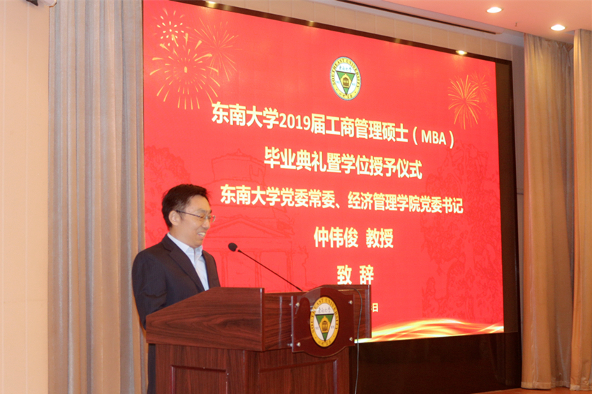 仲伟俊书记发表了热情洋溢的致辞。他首先代表学院全体教职工,向133位荣获工商管理硕士(MBA)学位的同学们表示热烈的祝贺,向默默耕耘的老师们和大力支持的亲属们表示衷心的感谢!仲书记说,2019年是新中国成立70周年,同学们在这么一个年份毕业,预示着你们的30周年毕业庆将与新中国的百年华诞同庆,这是多么有意义的幸运。他说,三年前你们带着憧憬跨入校门,三年的求学生涯,让你们在电影网站 这个大家庭里收获了成长,今天,你们带着MBA毕业生的新身份和工商管理领域的新知识迈出校门,希望大家始终如一地坚守内心的价值标准,树立有情怀的追求,保持强烈的责任感,摒弃短期的功利,投身更广阔的事业。仲书记真诚地勉励同学们:要将个人的发展融入人类的文明进步和中华民族的伟大复兴之中,让生命不断焕发光彩,无愧于时代,无愧于人生!
