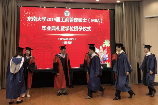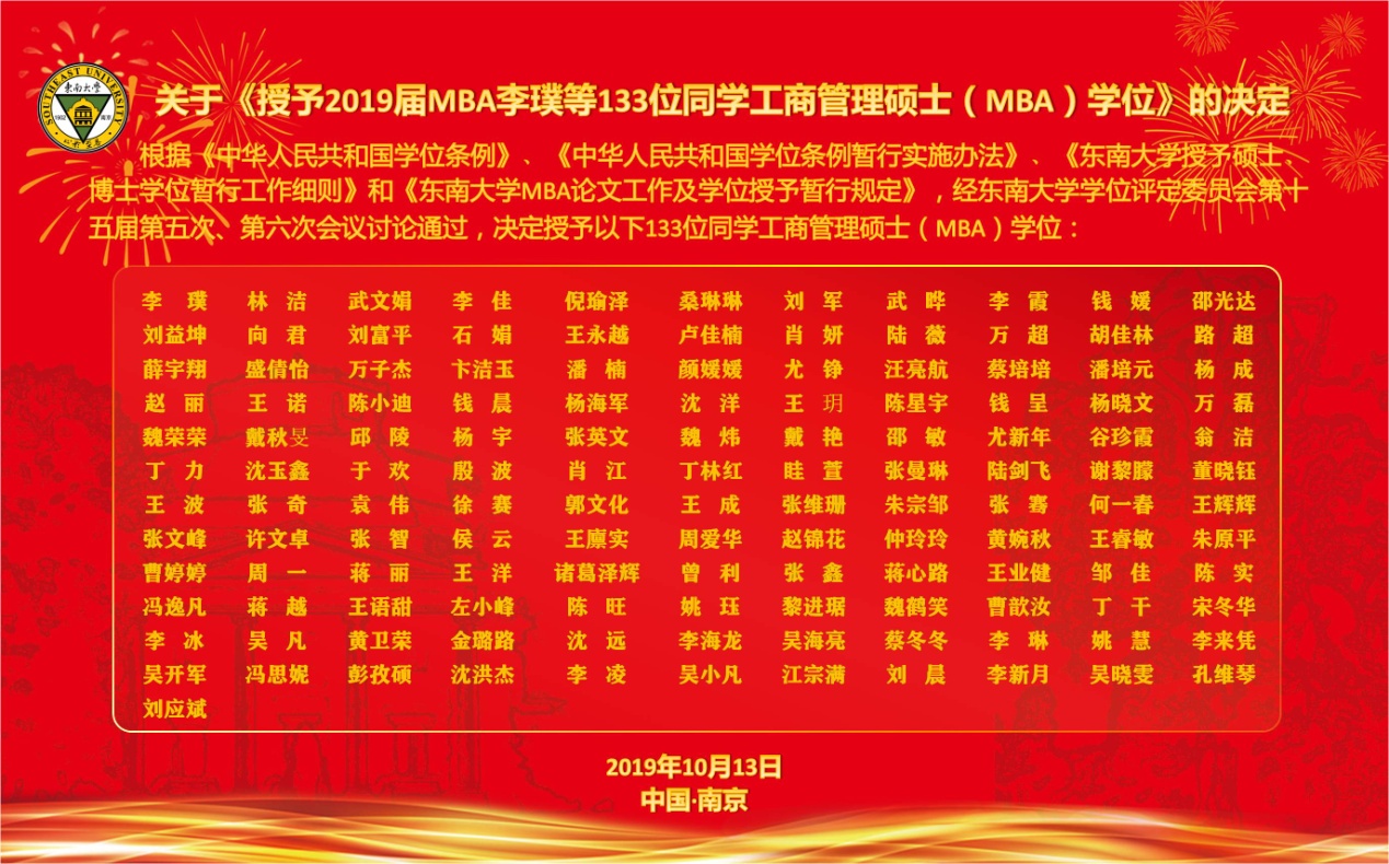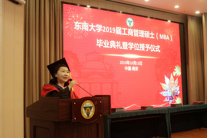 2019年10月13日,电影网站 2019届工商管理硕士(MBA)毕业典礼暨学位授予仪式在四牌楼校区榴园宾馆新华厅隆重举行。电影网站 党委常委、电影网站 党委书记仲伟俊教授,研究生院常务副院长金石教授,校研究生学位办公室主任吴在军教授,以及电影网站 祝虹副书记,江苏众阳新能源集团公司董事长王强校友等领导和嘉宾出席。毕业典礼暨学位授予仪式由电影网站 副院长吕鸿江教授主持。