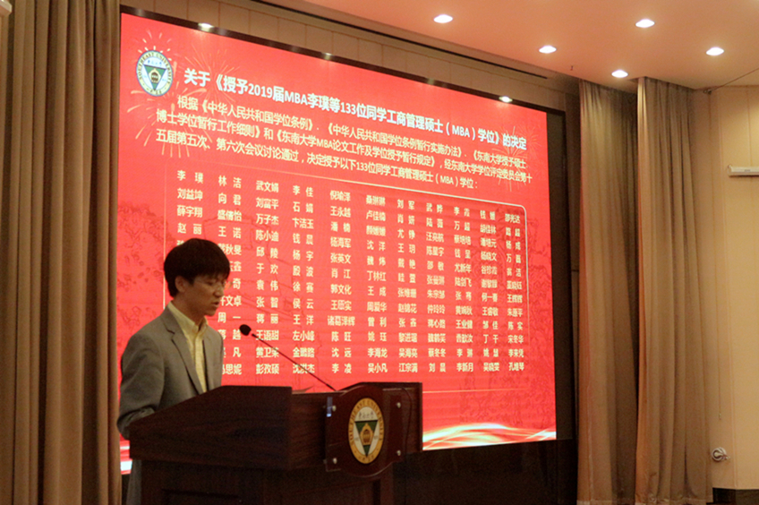 吴在军主任宣读了关于《授予2019届MBA李璞等133位同学工商管理硕士(MBA)学位》的决定;祝虹副书记宣读了《向君等16位MBA同学荣获电影网站 2019届优秀硕士毕业生》的表彰决定。