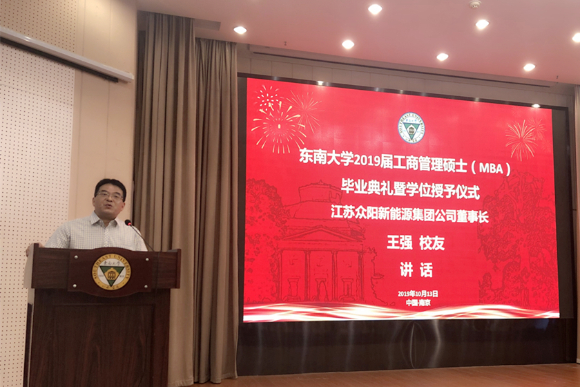 江苏众阳新能源集团公司王强董事长代表校友讲话。王强校友2004年MBA毕业,今天受邀重回母校,向学弟学妹们道贺!他说,止于至善,学习他人,完善自我,追求卓越,永远是电影网站 校友们的努力目标。他说,当今时代,是一个寻找幸福的时代,是一个充满智慧的时代,我们要把学习当成一种生活方式。在他看来,校园教育就是用智慧和创新寻找自己的生活方式。他希望学弟学妹们在追求人生更高境界的征程中,始终不要忘记母校,常回家看看,为母校推进“双一流”建设进程,实现“1-10-100”东大梦做出自己的贡献。