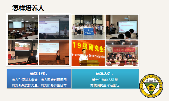 支部生活:两年多来,在学校、学院的支持下,支部成员成了我的战友们,我们通过党建有力引领学术攀登、有力孕育科研氛围、有力凝聚支部力量、有力服务师生日常为基础板块,以博士生党建大讲堂、高校研究生财经论坛为品牌活动,既提升了支部组织力,又使得支部党员在学术科研、实践服务中取得了优异成绩。