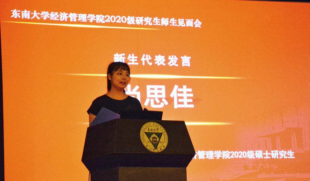 2018级硕士研究生杨萌同学作为在校研究生代表发言,她首先回顾了自己在东大生活的八年时间里东大校园建设的变化以及东大学科建设的快速发展,然后以邱海波教授为例阐述了作为一名东大人该有的家国情怀与国际视野,应努力成为担当引领未来和造福人类的领军人才,并表达对2020级全体新生的美好祝愿。