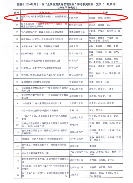 热烈祝贺电影网站 副院长吕鸿江教授团队撰写的案例“跨国并购下的子公司管理控制:TI的破茧化蝶之路”、案例中心主任周路路副教授团队撰写的案例“不落实就落空——黄山旅游绩效管理体系变革之路”荣获第十一届“全国百篇优秀管理案例”奖。