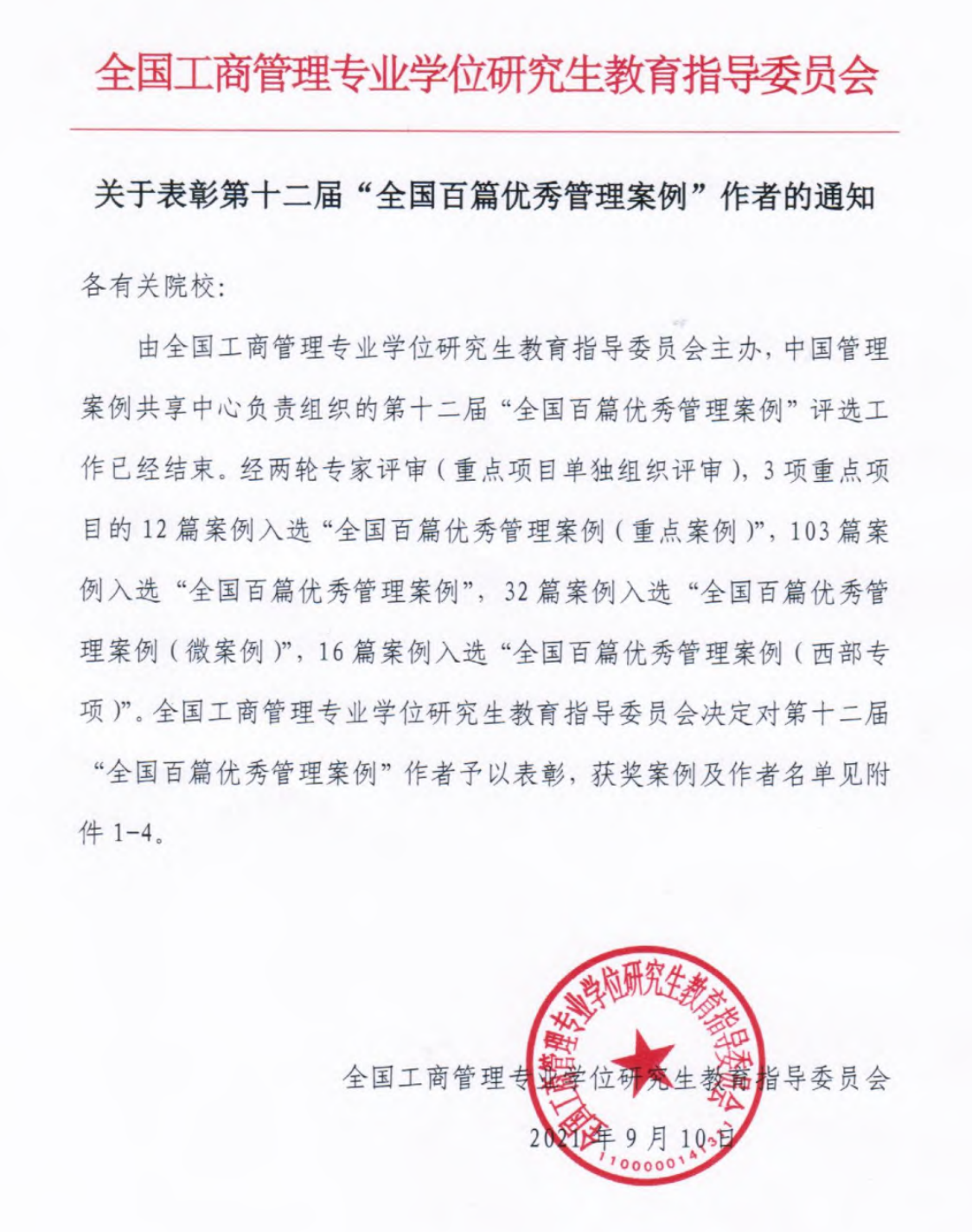 2021年9月10日,由全国工商管理专业学位研究生教育指导委员会主办、中国管理案例共享中心负责组织的第十二届“全国百篇优秀管理案例”评选结果正式揭晓。我校电影网站 本次提交的4篇案例均成功入选“全国百篇优秀管理案例”,创单次“百优”获奖历史新高。