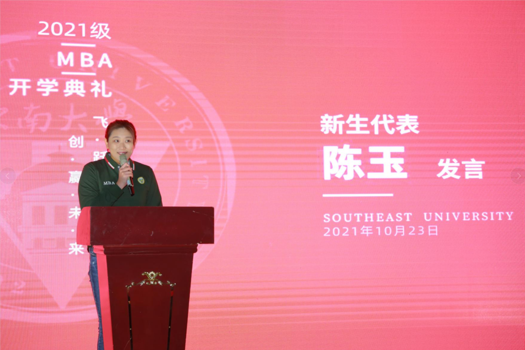 陈玉同学作为2021级MBA新生代表发言。她向大家分享了自己从备考到收到录取通知书再到开学的心路历程,她感恩有幸与大家一起融入到东大的MBA学习生活之中,实现思维的碰撞,交流精彩的人生。她倡议每一位同学在未来的日子里能够积极参与,主动思考,勇于实践,让MBA不仅仅成为学历的光环,更要成为职业进步和人生发展的助推器。
