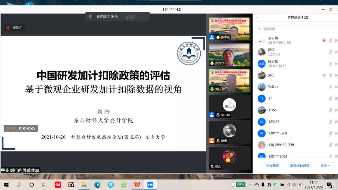 刘行教授就自己最新的研究成果“中国研发加计扣除政策的评估:基于微观企业研发加计扣除数据的视角”做了分享。张敦力教授对刘行教授的分享做了点评。