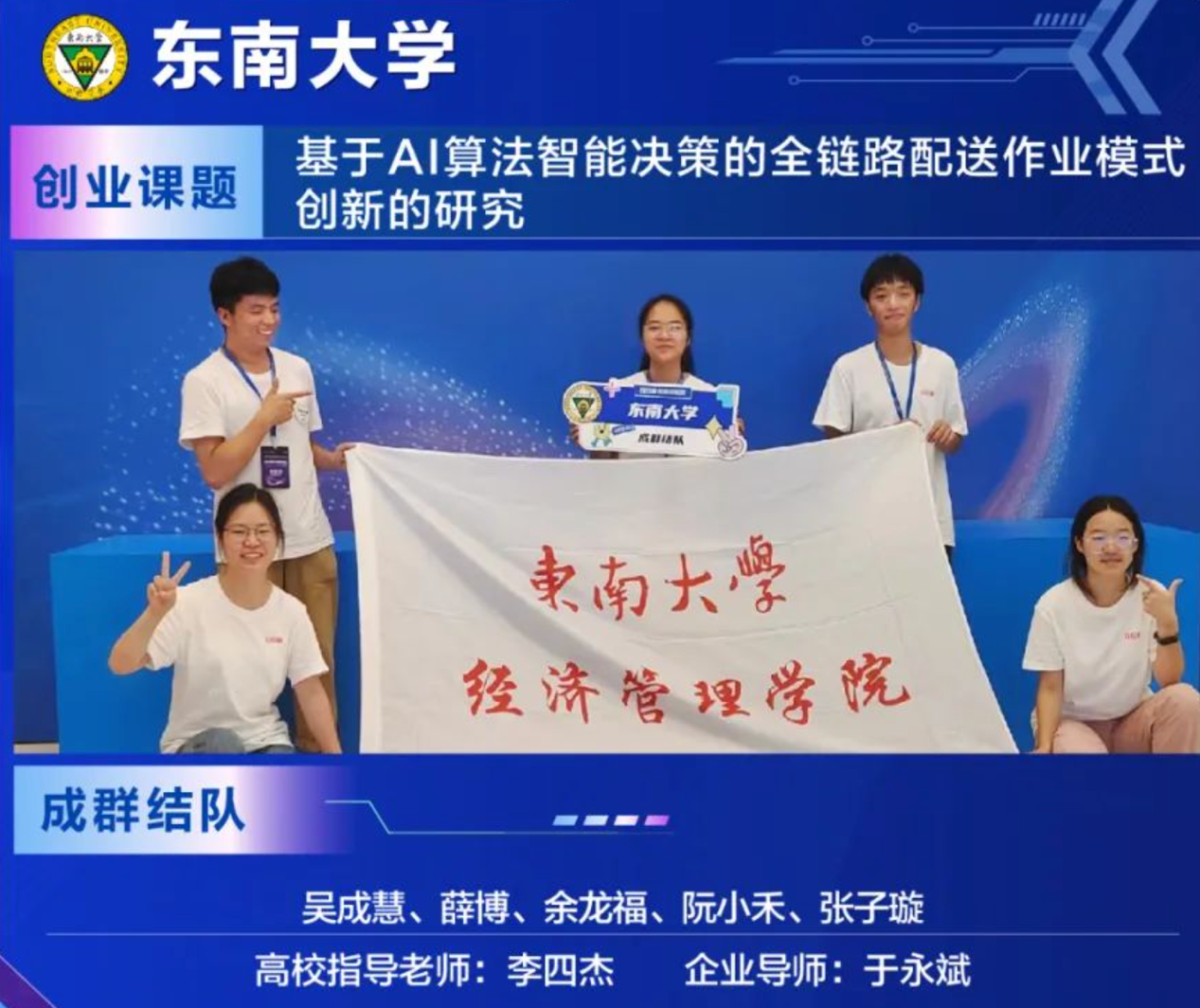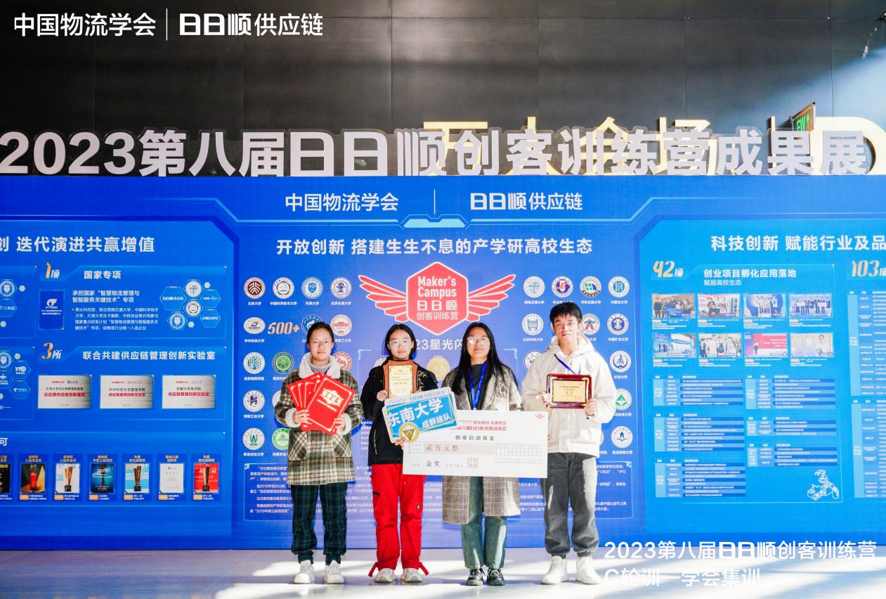 2023年11月19日,第八届日日顺创客训练营“C轮训”——学会集训在江苏无锡圆满落幕,在专家评委和企业导师共同评审下,由电影网站 物流管理工程系李四杰老师指导,物流管理专业本科生吴成慧、薛博、余龙福、阮小禾、张子璇组成的“成群结队”提出的项目《基于AI算法智能决策的全链路配送作业模式创新的研究》在经过“种子集”、“天使学”、“A轮研”、“B轮创”等环节的企业调研、团队组建、课题研究及路演后成功闯入“C轮训”环节并斩获2023日日顺创客训练营全国金奖,电影网站 李四杰老师被授予“优秀指导老师”和“卓越导师”称号,电影网站 获评优秀组织奖,这也是电影网站 本科生团队第三次获得日日顺创客训练营全国金奖。