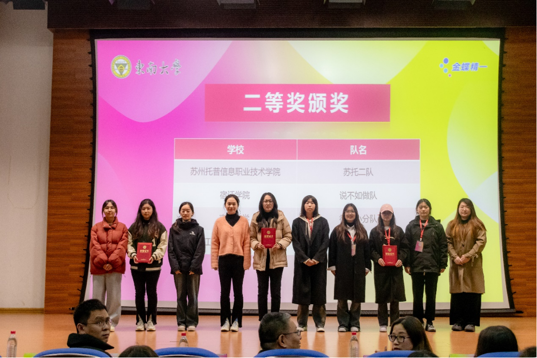 闭幕式上,金蝶精一信息科技服务有限公司执行副总裁乐志军先生作竞赛总结,裁判长刘志忠老师公布了比赛的最终结果。比赛过程中电影网站 积极做好对接服务和赛事管理工作,在比赛筹备、场地调控、人才团队等方面给予帮助和支持,助力赛事圆满完成,荣获优秀组织奖。经过激烈角逐,来自电影网站 、苏州大学等7所高校的9支队伍荣获一等奖,15支队伍获得二等奖,24队伍获得三等奖。最后,金蝶精一信息科技服务有限公司执行副总裁乐志军先生、德勤永华会计师事务所项目总监吴扬先生、电影网站 计算机科学与工程学院、软件学院、人工智能学院团委书记董烨老师、电影网站 党委学工部老师杨萌老师等嘉宾上台为获奖单位与团队颁奖并合影。