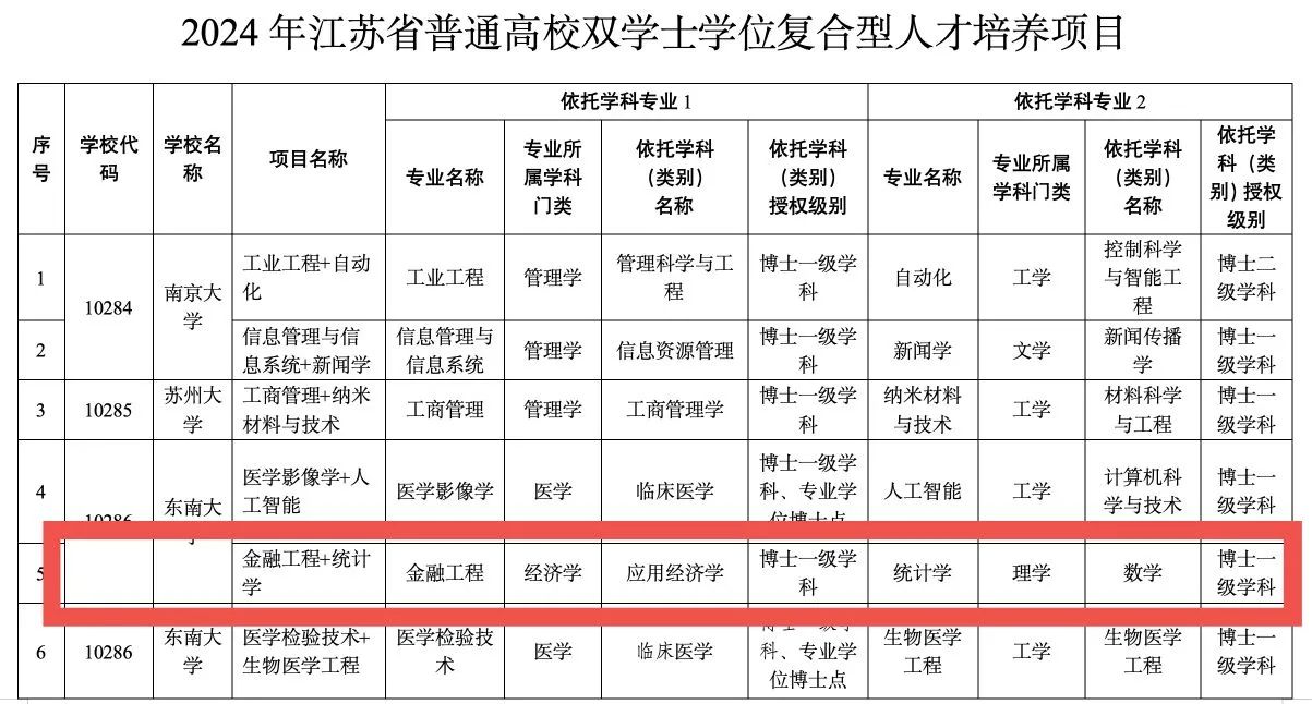 日前,江苏省学位委员会公布了2024年江苏省普通高校双学士学位复合型人才培养项目名单,电影网站 新增3个双学士学位。其中,电影网站 参与申报的"金融工程+统计学"双学士学位名列其中。