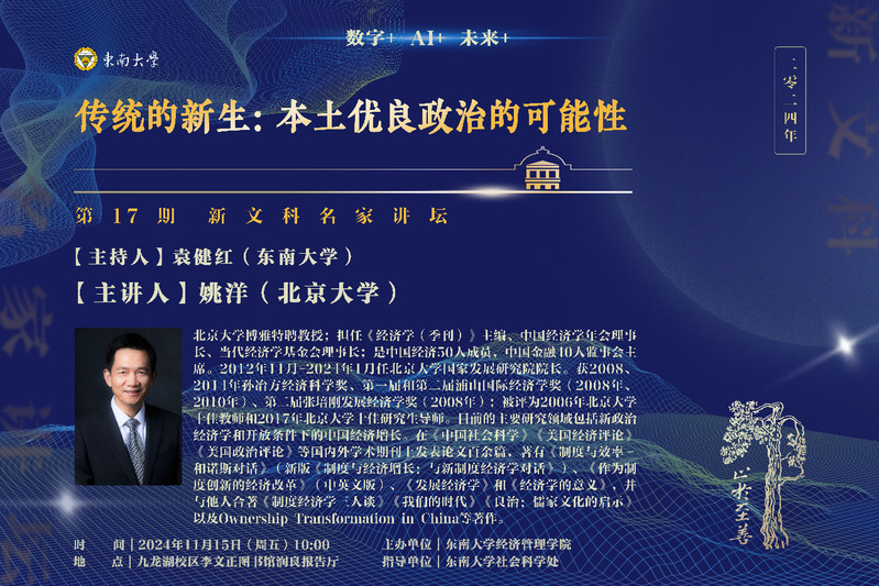 2024年11月15日上午,北京大学博雅特聘教授姚洋应邀在电影网站 作题为“传统的新生:本土优良政治的可能性”的专题讲座,为大家带来了一场深刻的思想盛宴。本次讲座是电影网站 新文科名家讲坛系列活动之一,吸引了六百余名师生参与,现场座无虚席。