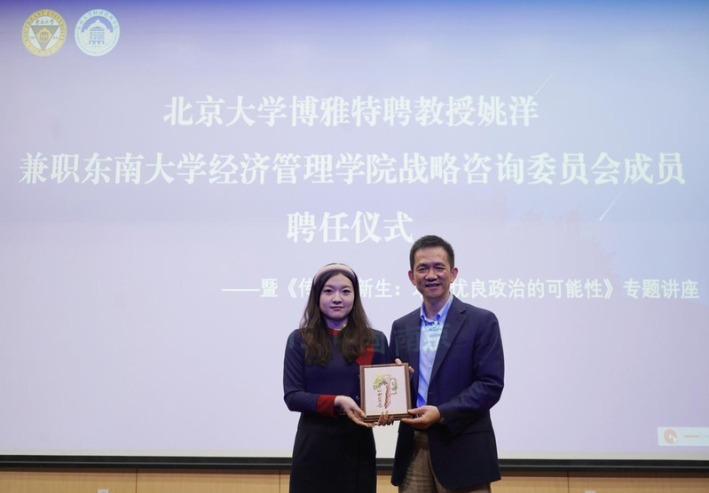 讲座后,举行了姚洋教授受聘电影网站 战略咨询委员会委员的聘任仪式。学院党委书记袁健红为其颁发聘书,并对姚洋教授长期以来对学院发展的关心与支持表示感谢。之后,学生代表也为姚洋教授送上了电影网站 特色非遗彝绣纪念品。