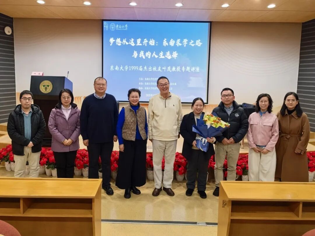 活动尾声,师生代表向叶茂教授献上鲜花与饱含东大特色的纪念品,表达对杰出校友的敬意与感谢。随后,各位领导老师与叶茂教授共同上台合影留念,为本次专题讲座画上圆满句号。