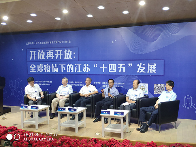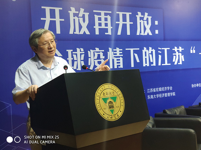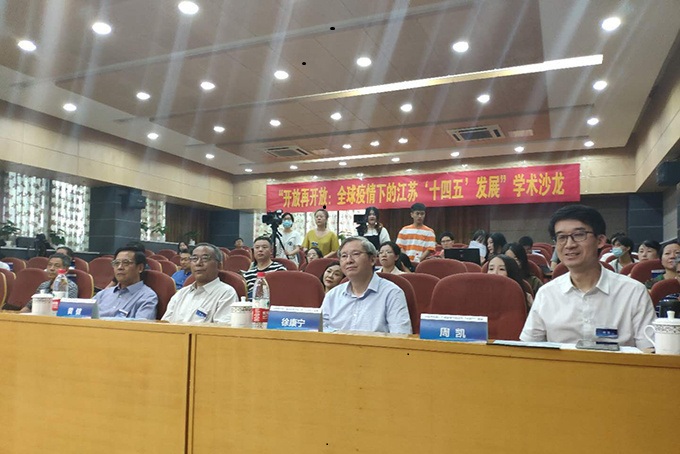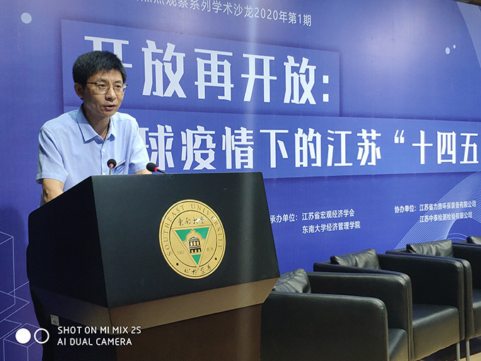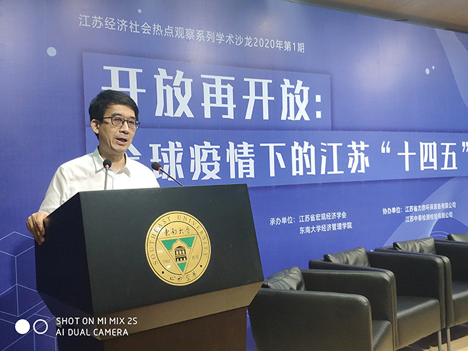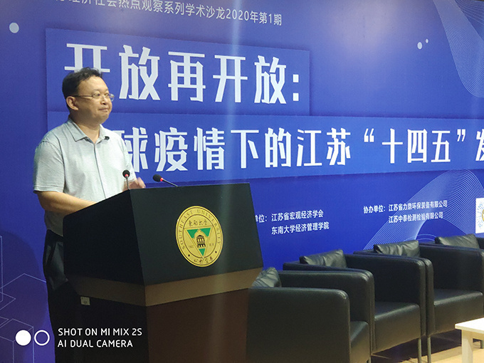 On August 29, Academic Salon "Opening up again: Jiangsu's 14th Five-Year Plan Development under the Global Epidemic", jointly organized by Jiangsu Federation of Philosophical and Social Sciences and Jiangsu Strategy and Development Research Center, and hosted by the School of Economics and Management of Southeast University and Jiangsu Macroeconomic Society, was held in the lecture hall of E&M Building of Southeast University. More than 20,000 people, including experts and scholars from the provincial macroeconomic control departments and macroeconomic research, representatives of member units of Jiangsu Macroeconomic Society and teachers and students of Southeast University, shared a feast of ideas from multiple perspectives online and offline. The salon was hosted by Yuan Jianhong, Secretary of the Party Committee of the School of Economics and Management of Southeast University and Secretary General of the Macroeconomic Society of Jiangsu Province.